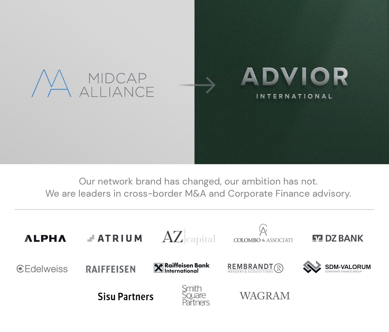 The board of Advior International is pleased to announce today the rebranding of the group previously known as the MidCap Alliance. The launch of the new brand recognises the commitment of members to significantly enhanced cooperation and integration as they build on their successful track record of advising on cross border M&A transactions.